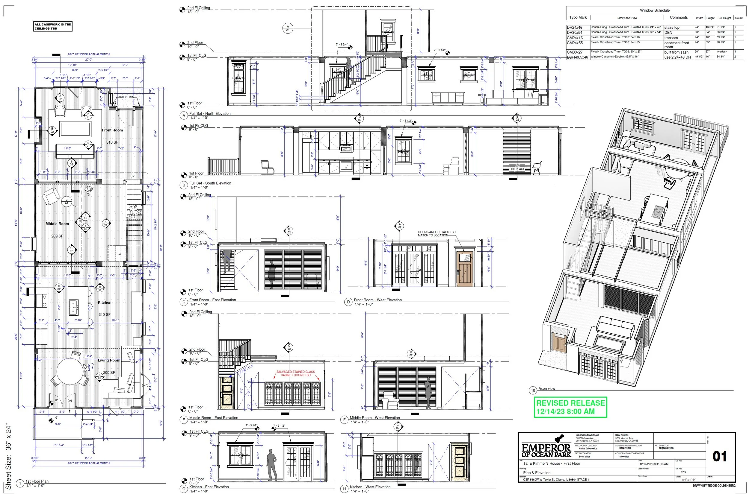 The idea for this house in Bronzeville, Chicago was that of a recent rehab that retains some of the characteristic Craftsman-style details, scattered throughout. To this end we have the typical window and door casing details, salvaged leaded-glass cabinet windows turned into a wall, and some original additions like the slat wall and slat fireplace.